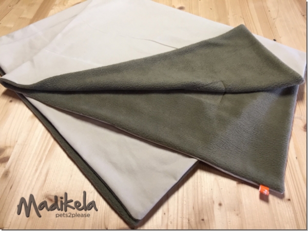 Diese Kuscheldecke besitzt eine Seite aus strapazierfähigem, aber weichem Canvas Baumwollstoff in der Farbe "Beige" und eine Seite aus weichem Antipilling-Fleece, welcher frei wählbar ist. Sie ist ohne Polsterung genäht - daher eine dünne Kuscheldecke für jeden Anlaß.