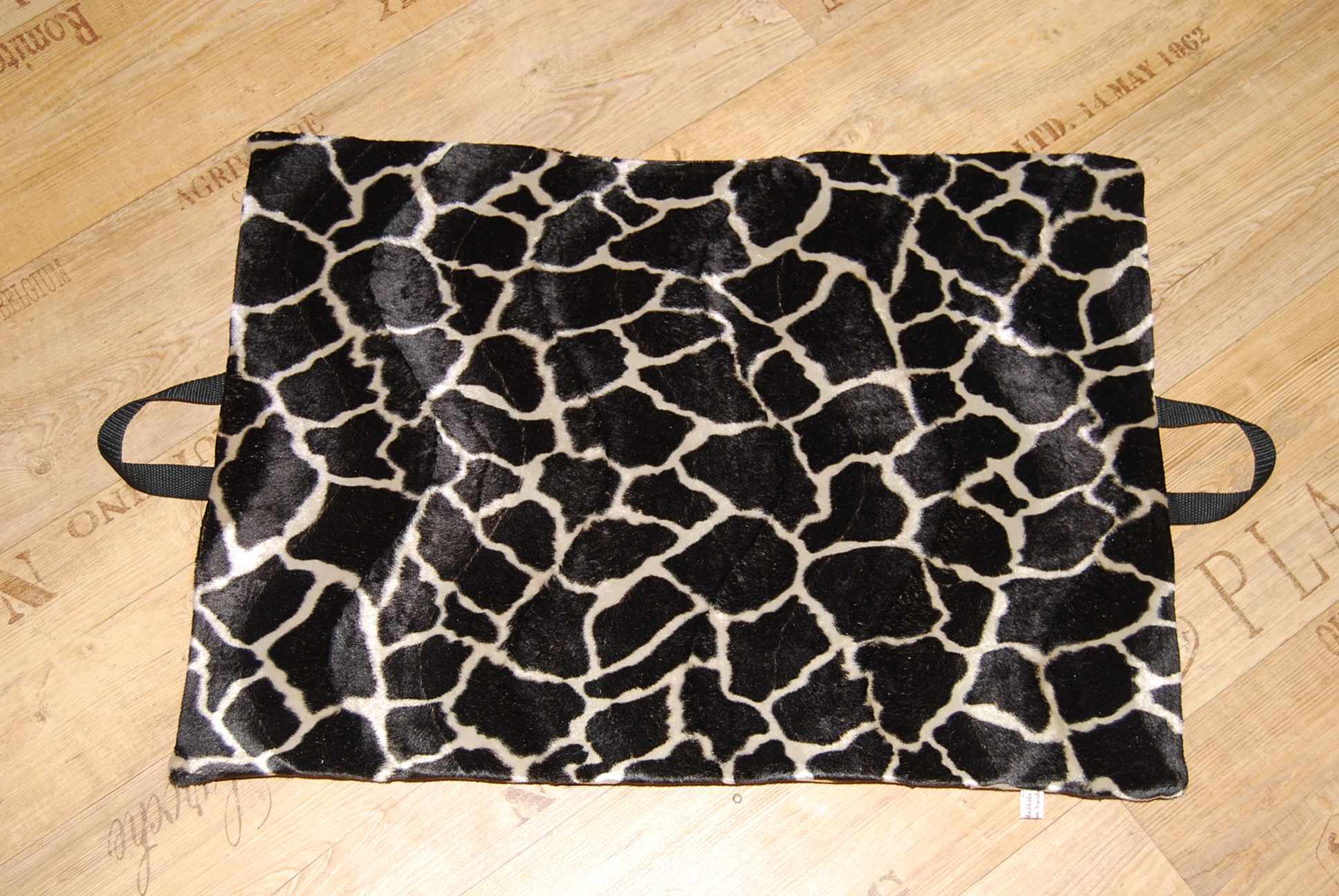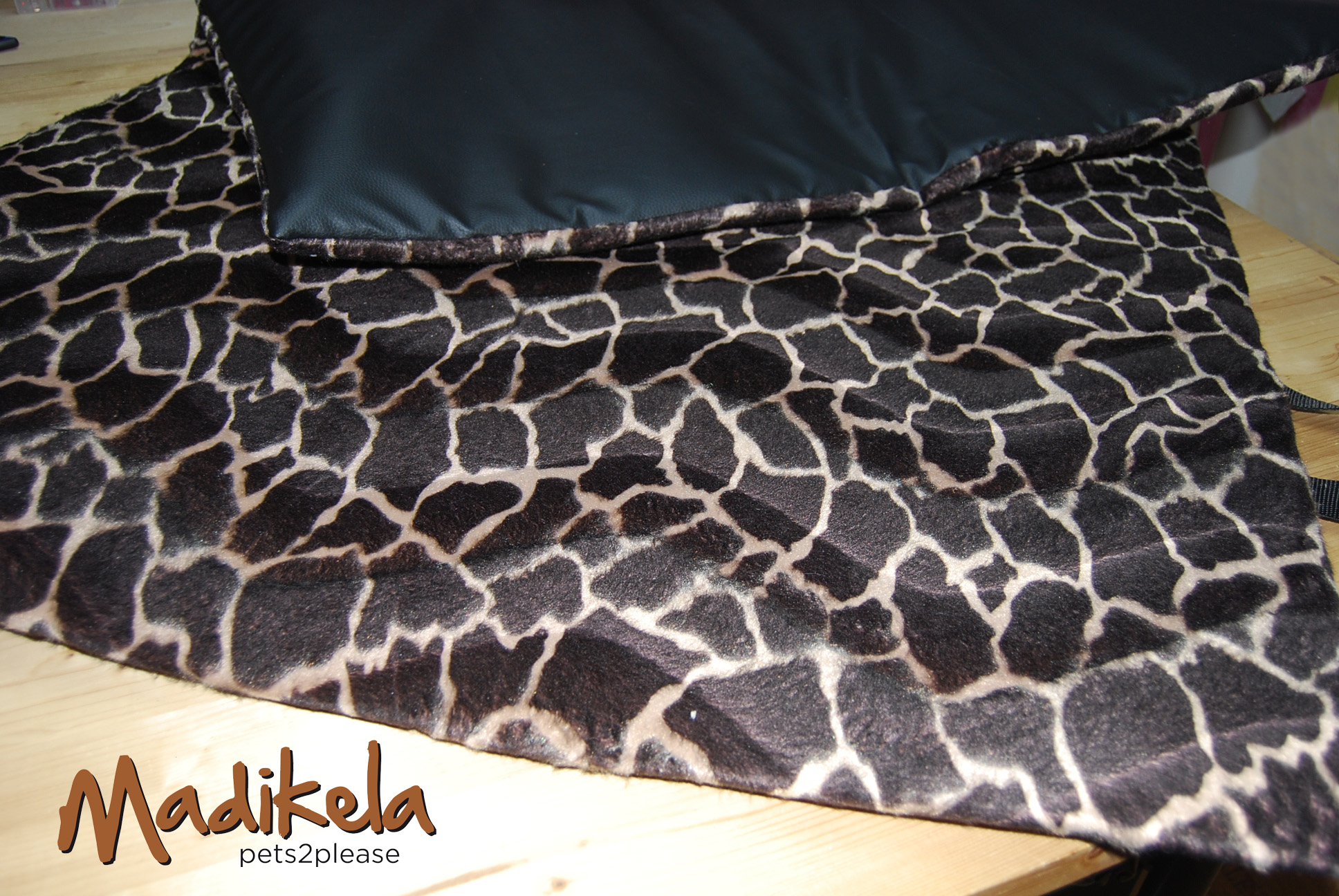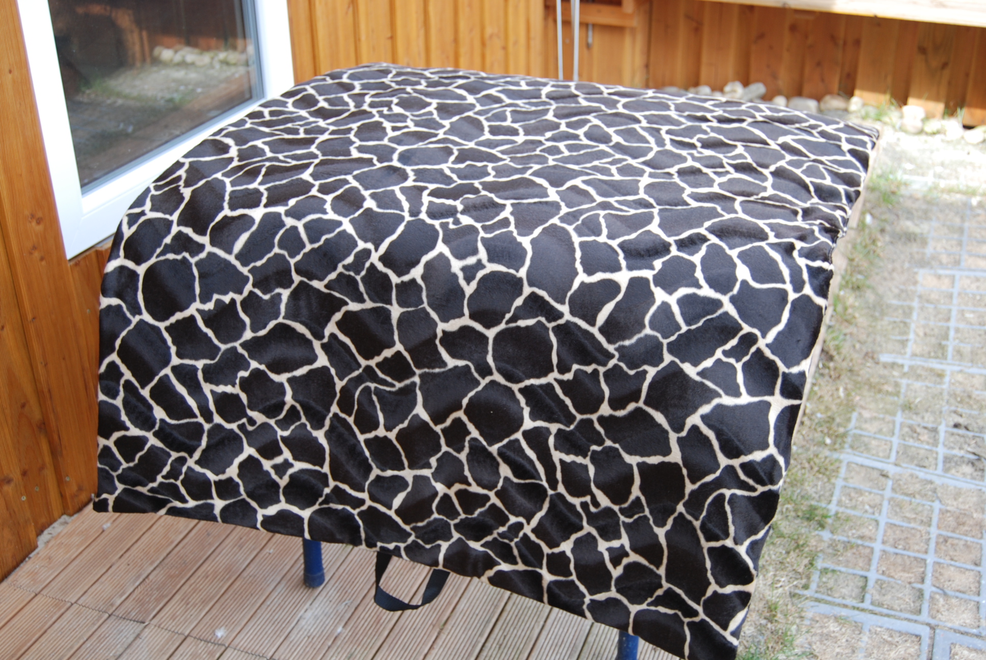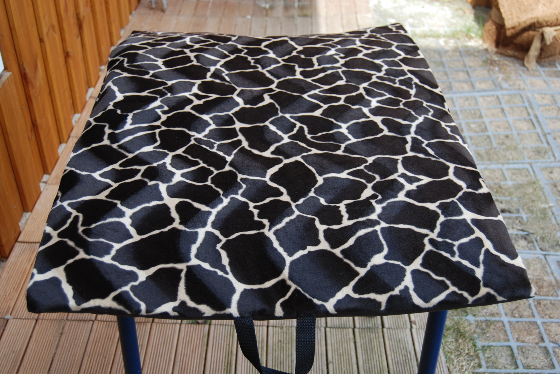 Diese Outdoordecke besitzt eine Oberseite aus Tierfellstoff im Design "Giraffe groß" und eine Unterseite aus strapazierfähigem Kunstleder. Als Polsterung verwenden wir 400 g/m2 starkes Volumenvlies, welches fest mit dem Stoff vernäht wird.