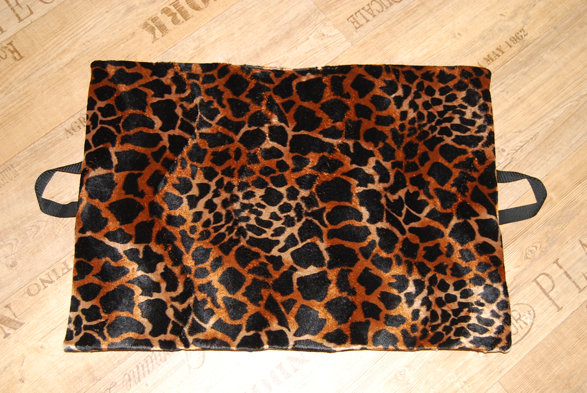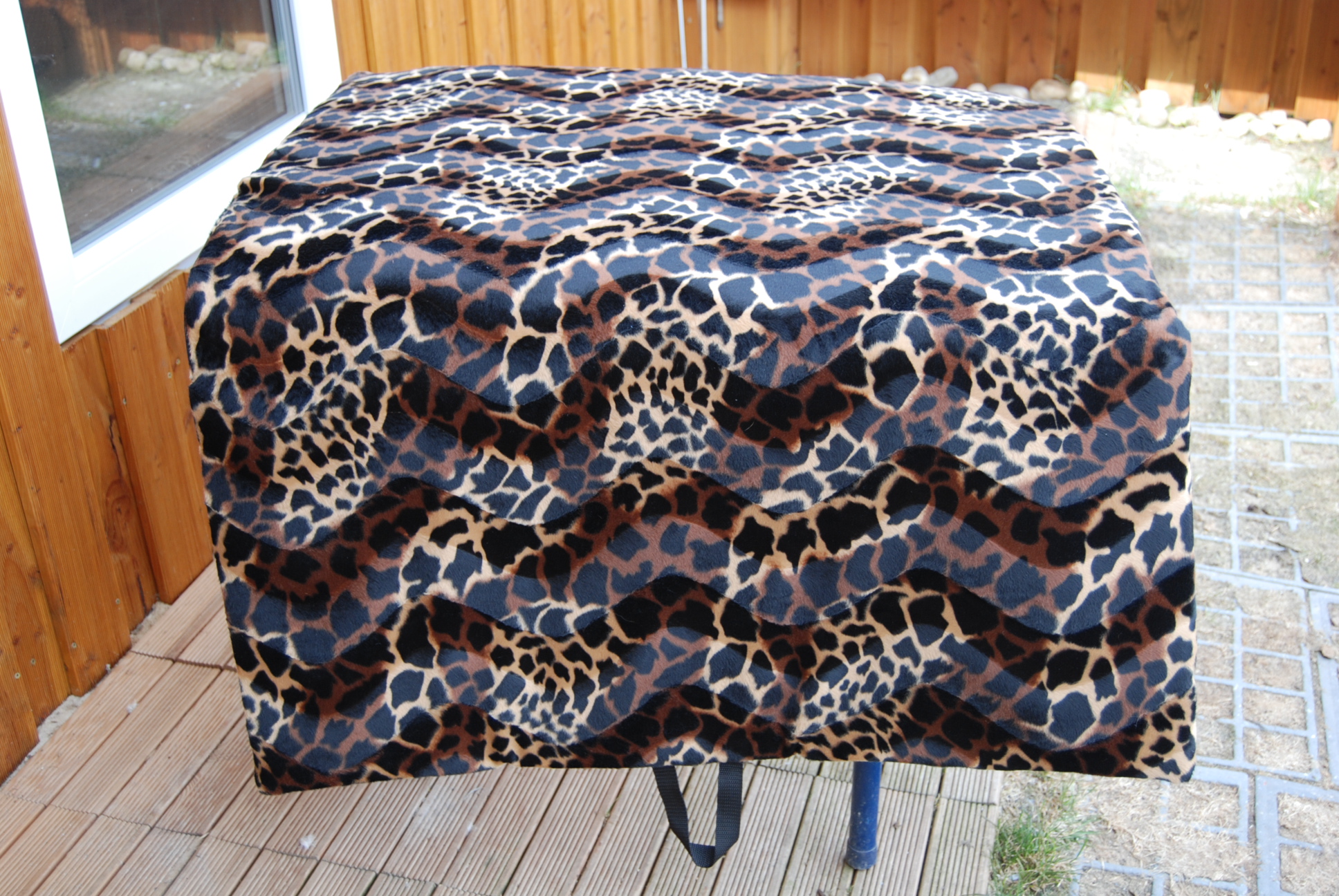 Diese Outdoordecke besitzt eine Oberseite aus Tierfellstoff im Design "Giraffe mittel" und eine Unterseite aus strapazierfähigem Kunstleder. Als Polsterung verwenden wir 400 g/m2 starkes Volumenvlies, welches fest mit dem Stoff vernäht wird.