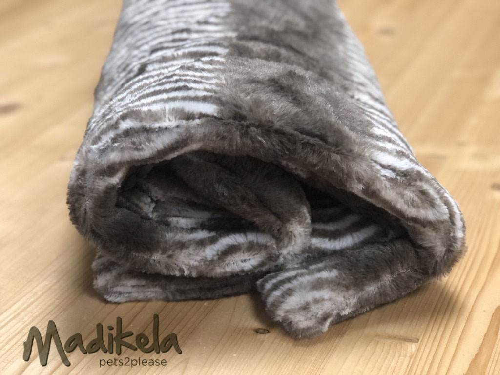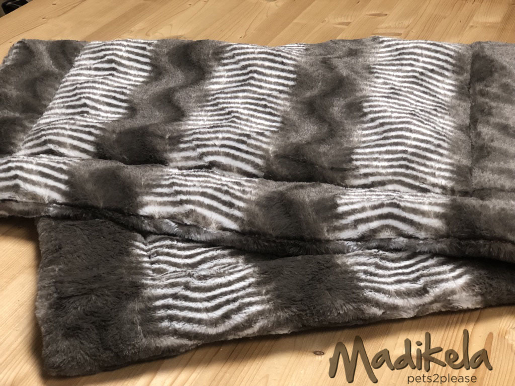 Diese Kuscheldecke ist beidseitig aus Pelzimitat im Design "grau-weiß" genäht. Als Polsterung verwenden wir 200 g/m2 starkes Volumenvlies, welches fest mit dem Stoff vernäht wird.