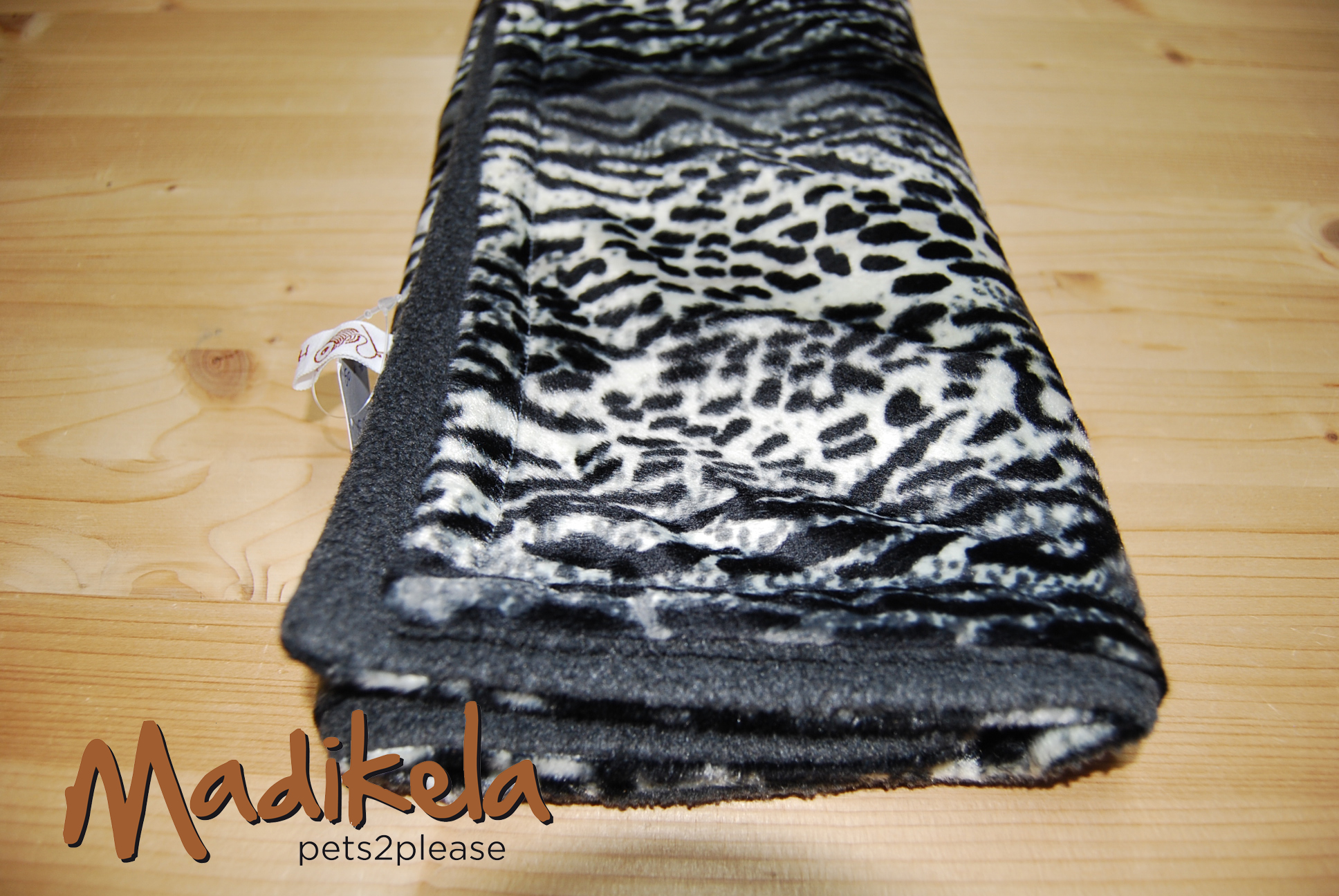 Diese Kuscheldecke besitzt eine Seite aus Tierfellstoff in der Farbe "Schneetiger" und eine Seite aus weichem Antipilling-Fleece in der Farbe stein. Sie ist ohne Polsterung genäht - daher eine dünne Kuscheldecke für jeden Anlaß.
