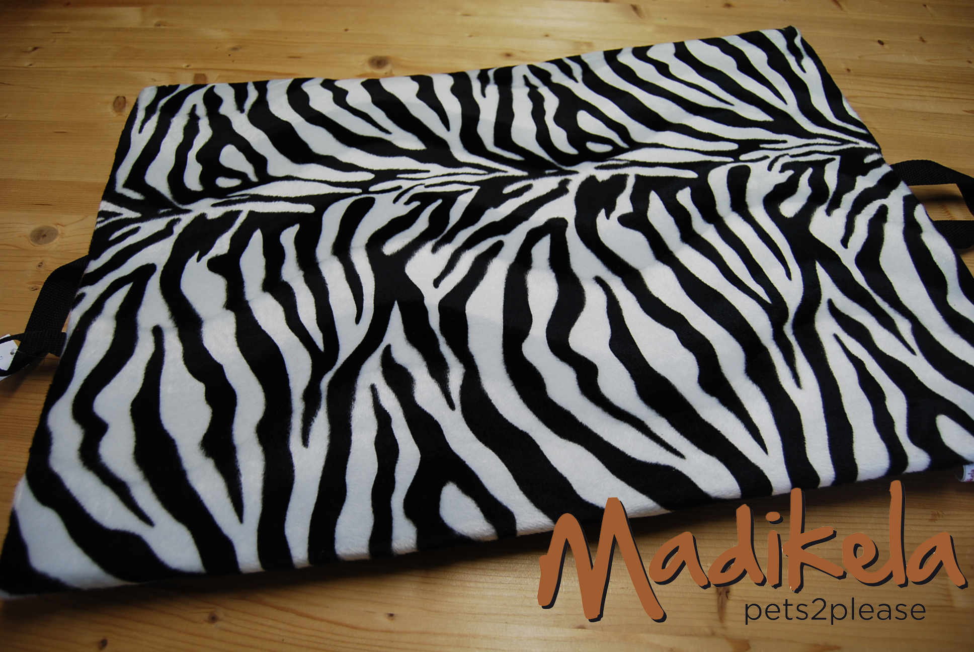 Diese Outdoordecke besitzt eine Oberseite aus Tierfellstoff im Design "Zebra" und eine Unterseite aus strapazierfähigem Kunstleder. Als Polsterung verwenden wir 400 g/m2 starkes Volumenvlies, welches fest mit dem Stoff vernäht wird.