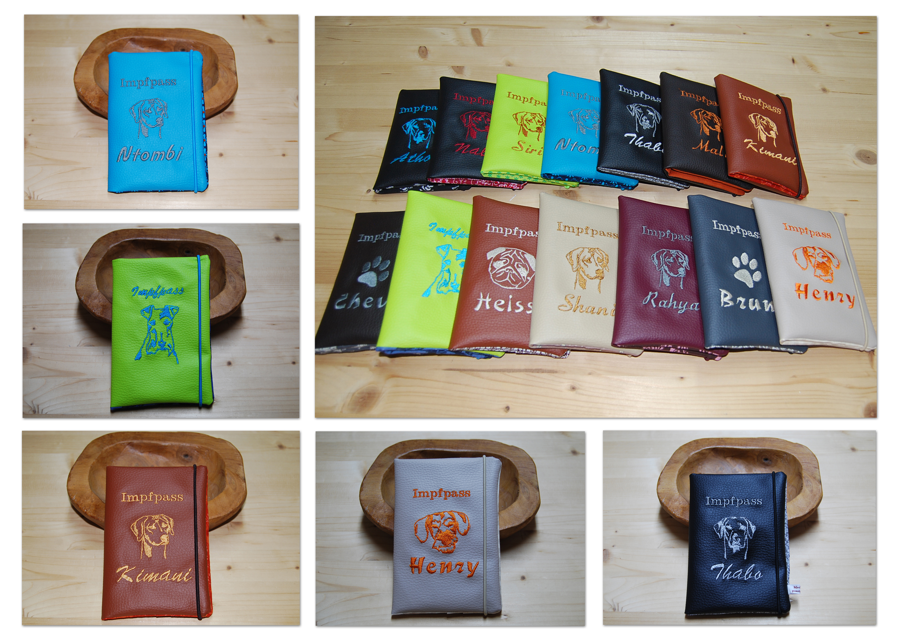 Damit auch der Impfausweis Ihres Hundes immer griffbereit und auch schön verpackt ist, gibt es unsere Impfpasshüllen aus pflegeleichtem Kunstleder in vielen Farben und Motiven. Individualisierbar mit dem Namen Ihres Hundes.