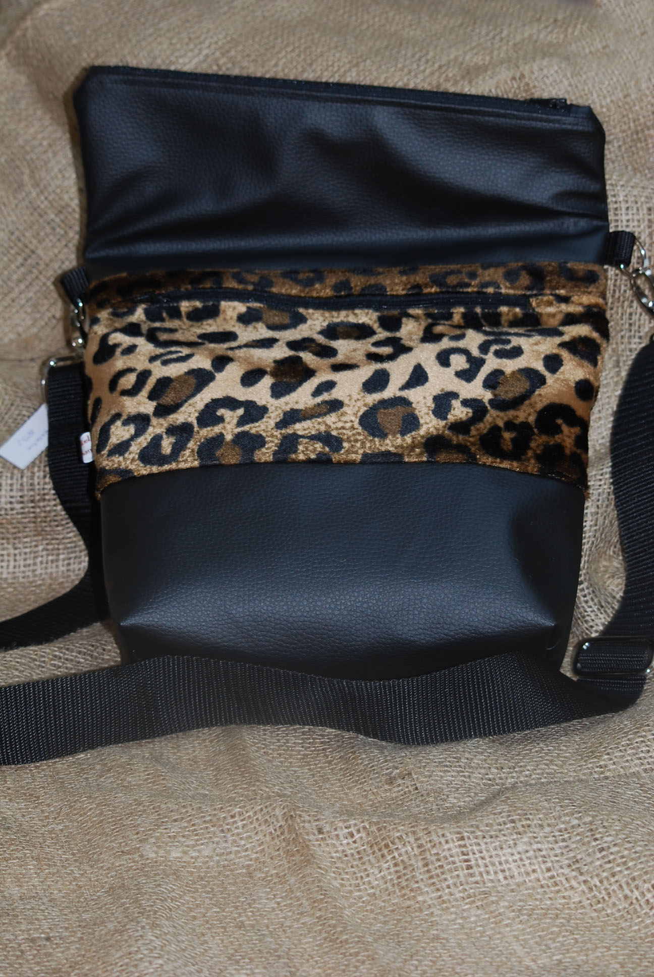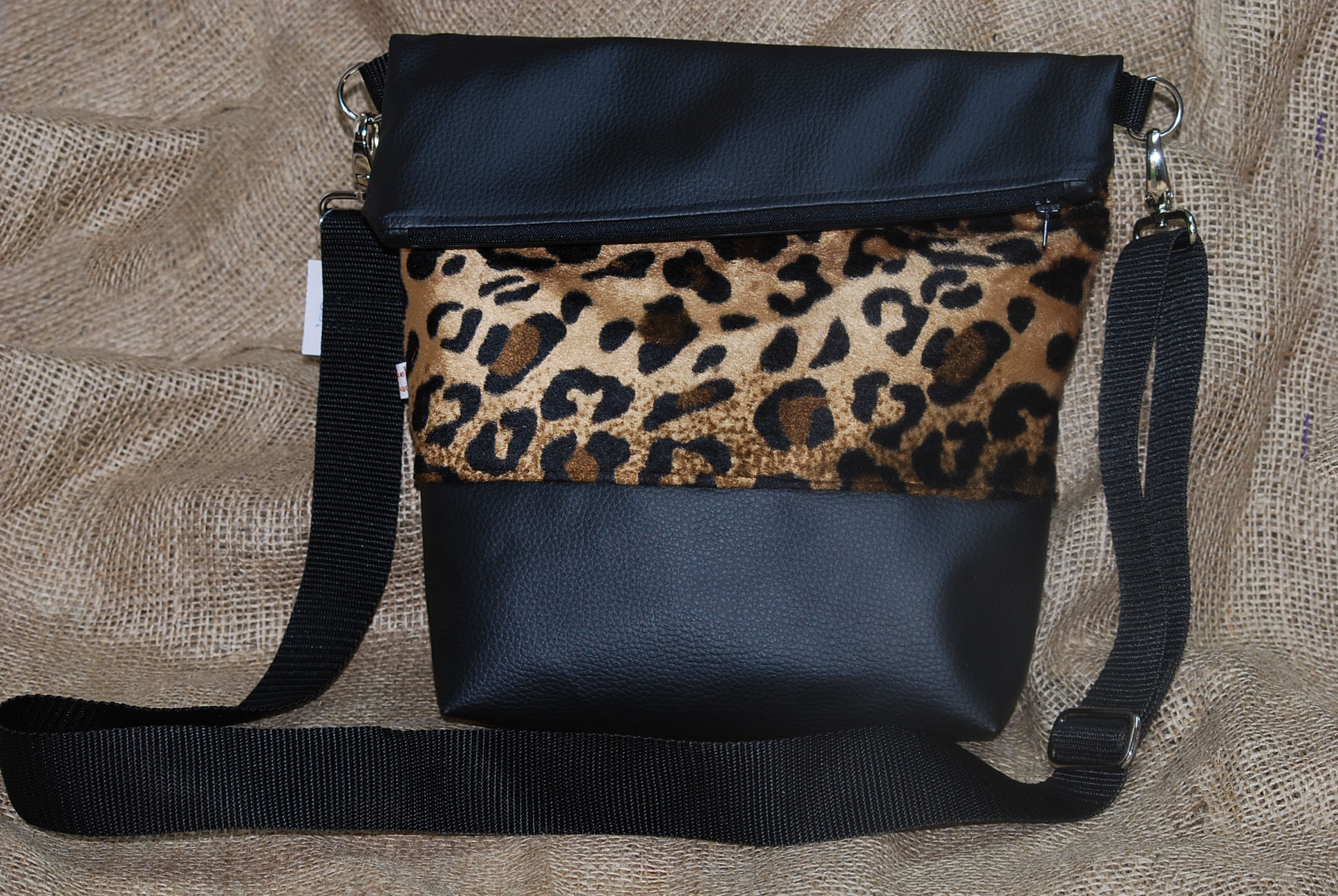 Kombination aus schwarzem Kunstleder und Tierfellimitat Leo braun. Innenfutter aus passendem Baumwollstoff. Die Tasche hat ein jeweils ein Außen- und ein Innenfach mit Reißverschluss sowie innen noch ein zusätzliches Steckfach. Geschlossen wird die Tasche ebenfalls durch einen Reißverschluss, so dass der Inhalt gut verwahrt ist.